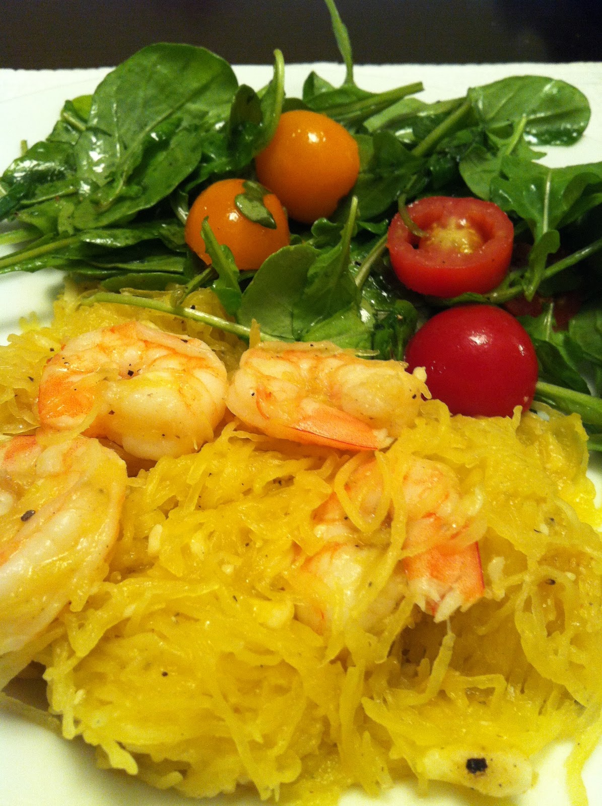 10) Once shrimp is cooked, remove tails and add to spaghetti squash. Make sure to add all the juices to the squash as well.